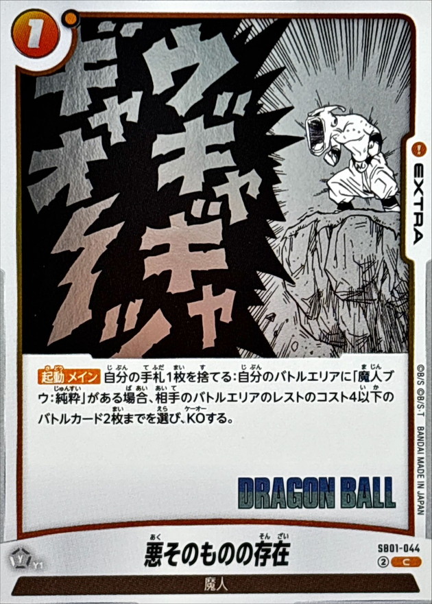 効果 【起動 メイン】自分の手札1枚を捨てる:自分のバトルエリアに「魔人ブウ:純粋」がある場合、相手のバトルエリアのレストのコスト4以下のバトルカード2枚までを選び、KOする。 | |
