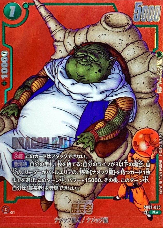 効果 【永続】このカードはアタックできない。【登場時】自分の手札1枚を捨てる:自分のライフが3以下の場合、自分の、リーダーかバトルエリアの、特徴《ナメック星》を持つカード1枚までを選び、このターン中、パワー+15000。その後、このターン中、自分は「最長老」を登場できない。 | |