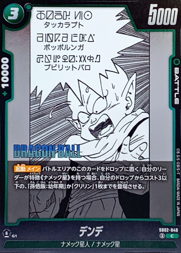 効果 【起動 メイン】バトルエリアのこのカードをドロップに置く:自分のリーダーが特徴《ナメック星》を持つ場合、自分のドロップからコスト3以下の、「孫悟飯:幼年期」か「クリリン」1枚までを登場させる。 | |