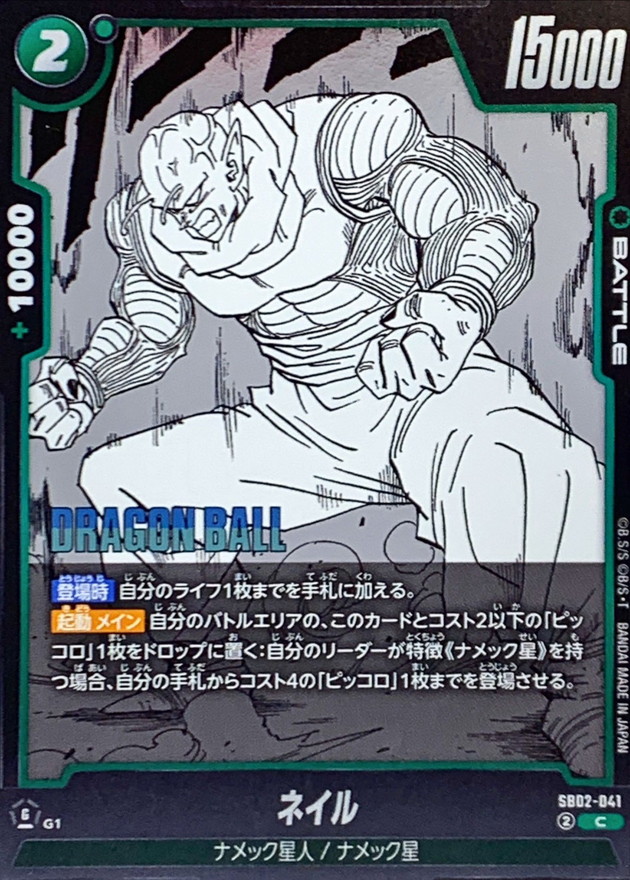 効果 【登場時】自分のライフ1枚までを手札に加える。【起動 メイン】自分のバトルエリアの、このカードとコスト2以下の「ピッコロ」1枚をドロップに置く:自分のリーダーが特徴《ナメック星》を持つ場合、自分の手札からコスト4の「ピッコロ」1枚までを登場させる。 | |