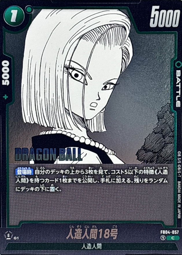 効果 【登場時】自分のデッキの上から3枚を見て、コスト5以下の特徴《人造人間》を持つカード1枚までを公開し、手札に加える。残りをランダムにデッキの下に置く。 | |