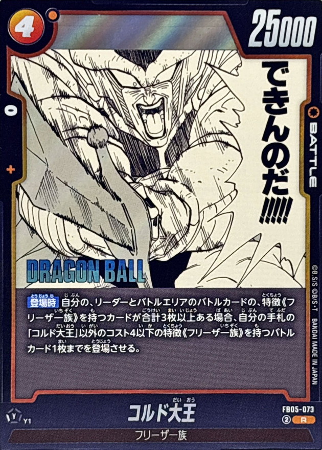 効果 【登場時】自分の、リーダーとバトルエリアのバトルカードの、特徴《フリーザ一族》を持つカードが合計3枚以上ある場合、自分の手札の「コルド大王」以外のコスト4以下の特徴《フリーザ一族》を持つバトルカード1枚までを登場させる。 | |