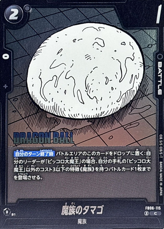効果 【自分のターン終了時】バトルエリアのこのカードをドロップに置く:自分のリーダーが「ピッコロ大魔王」の場合、自分の手札の「ピッコロ大魔王」以外のコスト3以下の特徴《魔族》を持つバトルカード1枚までを登場させる。 | |