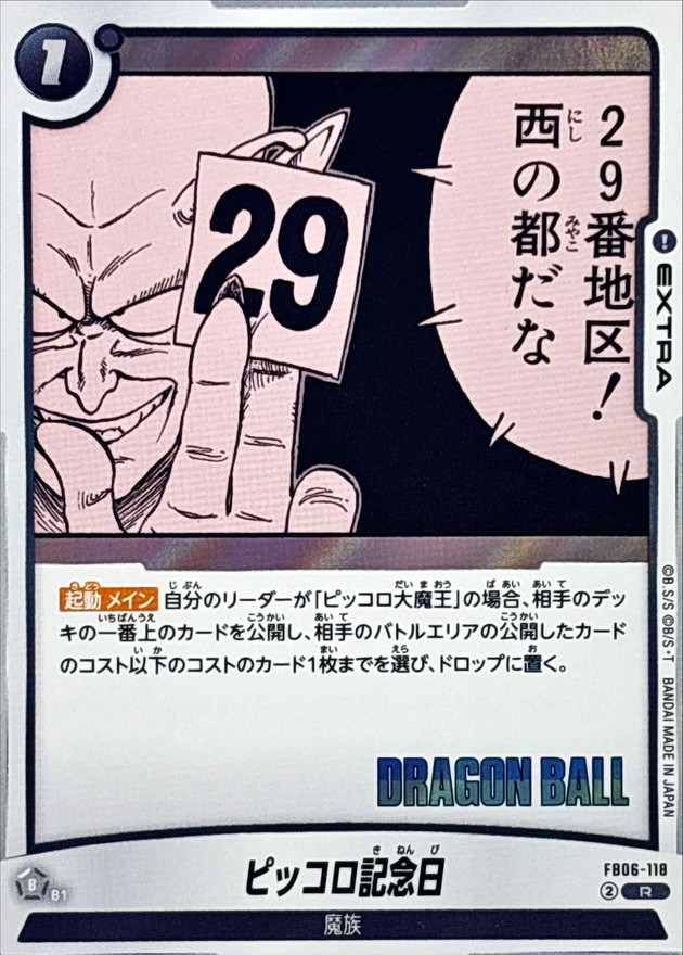 効果 【起動 メイン】自分のリーダーが「ピッコロ大魔王」の場合、相手のデッキの一番上のカードを公開し、相手のバトルエリアの公開したカードのコスト以下のコストのカード1枚までを選び、ドロップに置く。 | |
