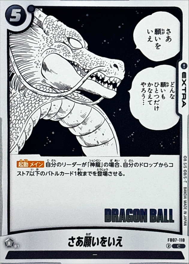 効果 【起動 メイン】自分のリーダーが「神龍」の場合、自分のドロップからコスト7以下のバトルカード1枚までを登場させる。 | |