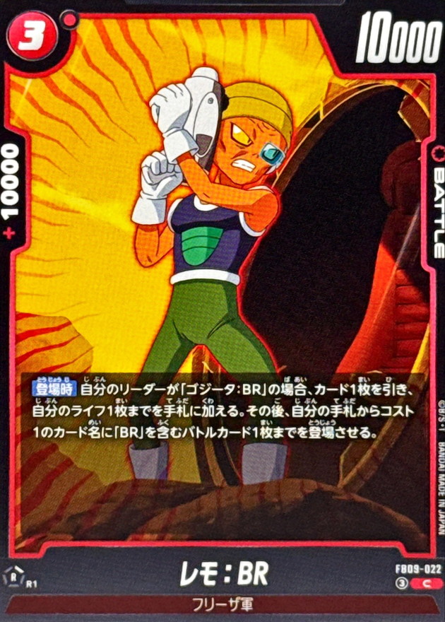 効果 【登場時】自分のリーダーが「ゴジータ:BR」の場合、カード1枚を引き、自分のライフ1枚までを手札に加える。その後、自分の手札からコスト1のカード名に「BR」を含むバトルカード1枚までを登場させる。 | |