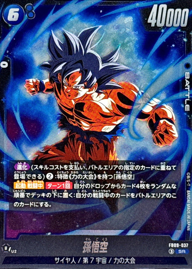 効果 【進化】(スキルコストを支払い、バトルエリアの指定のカードに重ねて登場できる)(2):特徴《力の大会》を持つ「孫悟空」【起動 戦闘中】【ターン1回】自分のドロップからカード4枚をランダムな順番でデッキの下に置く:自分の戦闘中のカードをバトルエリアのこのカードにする。 | |