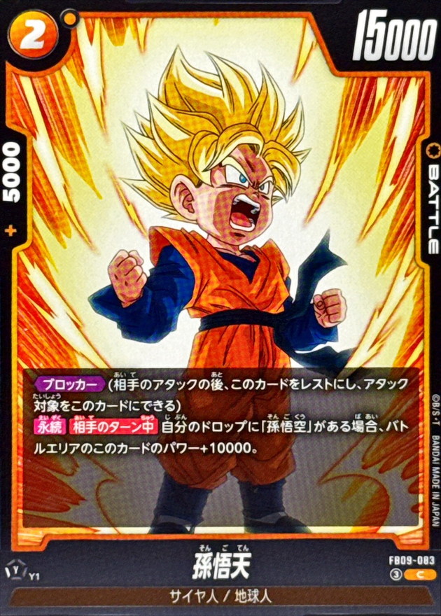 効果 【ブロッカー】(相手のアタックの後、このカードをレストにし、アタック対象をこのカードにできる)【永続】【相手のターン中】自分のドロップに「孫悟空」がある場合、バトルエリアのこのカードのパワー+10000。 | |