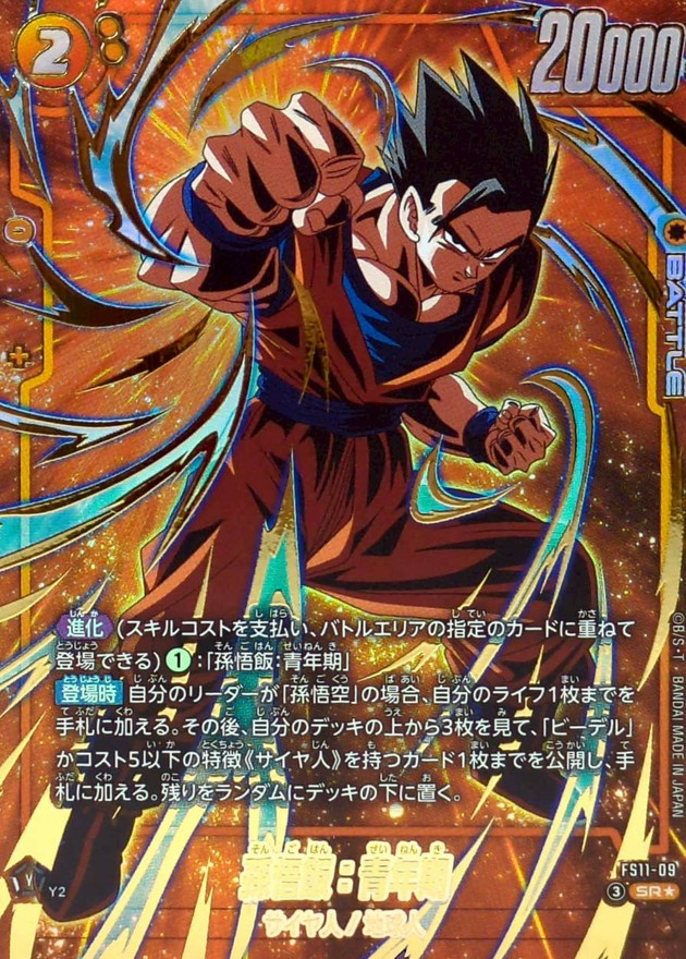 効果 【進化】(スキルコストを支払い、バトルエリアの指定のカードに重ねて登場できる)(1):「孫悟飯:青年期」【登場時】自分のリーダーが「孫悟空」の場合、自分のライフ1枚までを手札に加える。その後、自分のデッキの上から3枚を見て、「ビーデル」かコスト5以下の特徴《サイヤ人》を持つカード1枚までを公開し、手札に加える。残りをランダムにデッキの下に置く。 | |