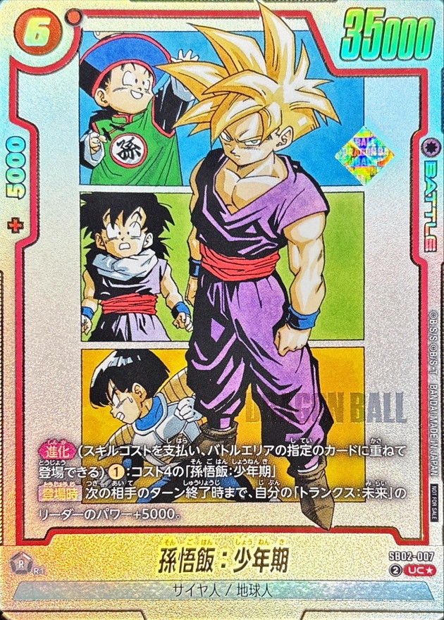 効果 【進化】(スキルコストを支払い、バトルエリアの指定のカードに重ねて登場できる)(1):コスト4の「孫悟飯:少年期」 | |