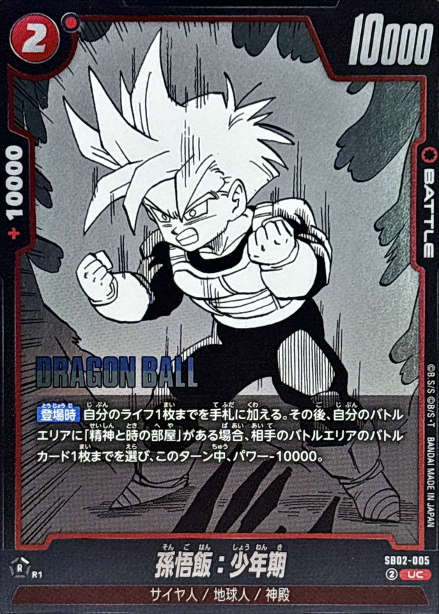 効果 【登場時】自分のライフ1枚までを手札に加える。その後、自分のバトルエリアに「精神と時の部屋」がある場合、相手のバトルエリアのバトルカード1枚までを選び、このターン中、パワー-10000。 | |