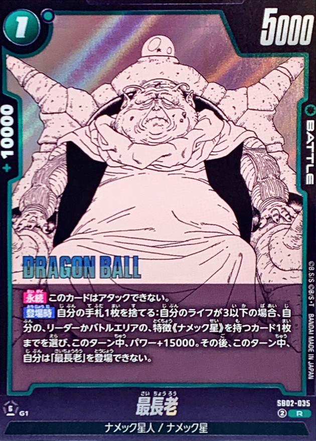 効果 【永続】このカードはアタックできない。【登場時】自分の手札1枚を捨てる:自分のライフが3以下の場合、自分の、リーダーかバトルエリアの、特徴《ナメック星》を持つカード1枚までを選び、このターン中、パワー+15000。その後、このターン中、自分は「最長老」を登場できない。 | |
