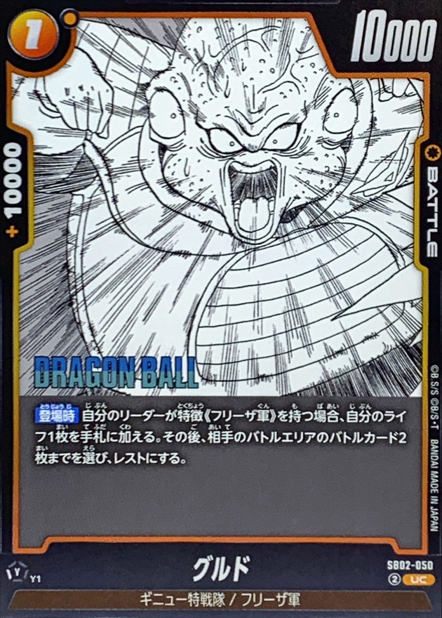 効果 【登場時】自分のリーダーが特徴《フリーザ軍》を持つ場合、自分のライフ1枚を手札に加える。その後、相手のバトルエリアのバトルカード2枚までを選び、レストにする。 | |