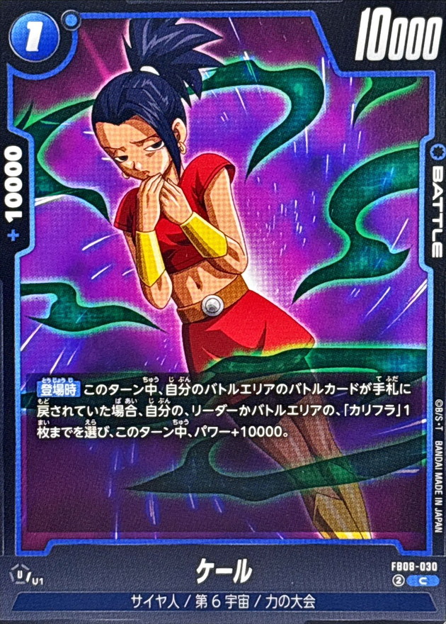 効果 【登場時】このターン中、自分のバトルエリアのバトルカードが手札に戻されていた場合、自分の、リーダーかバトルエリアの、「カリフラ」1枚までを選び、このターン中、パワー+10000。 | |