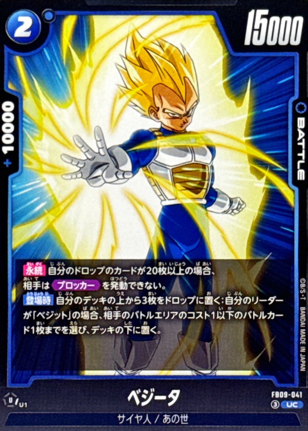 効果 【永続】自分のドロップのカードが20枚以上の場合、相手は【ブロッカー】を発動できない。【登場時】自分のデッキの上から3枚をドロップに置く:自分のリーダーが「ベジット」の場合、相手のバトルエリアのコスト1以下のバトルカード1枚までを選び、デッキの下に置く。 | |
