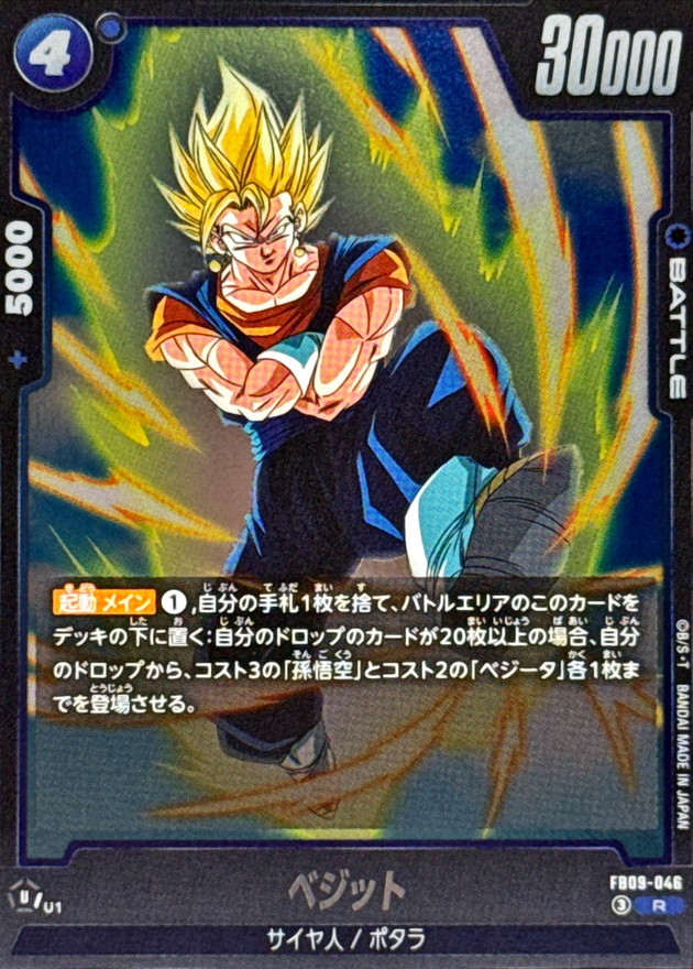 効果 【起動 メイン】(1),自分の手札1枚を捨て、バトルエリアのこのカードをデッキの下に置く:自分のドロップのカードが20枚以上の場合、自分のドロップから、コスト3の「孫悟空」とコスト2の「ベジータ」各1枚までを登場させる。 | |