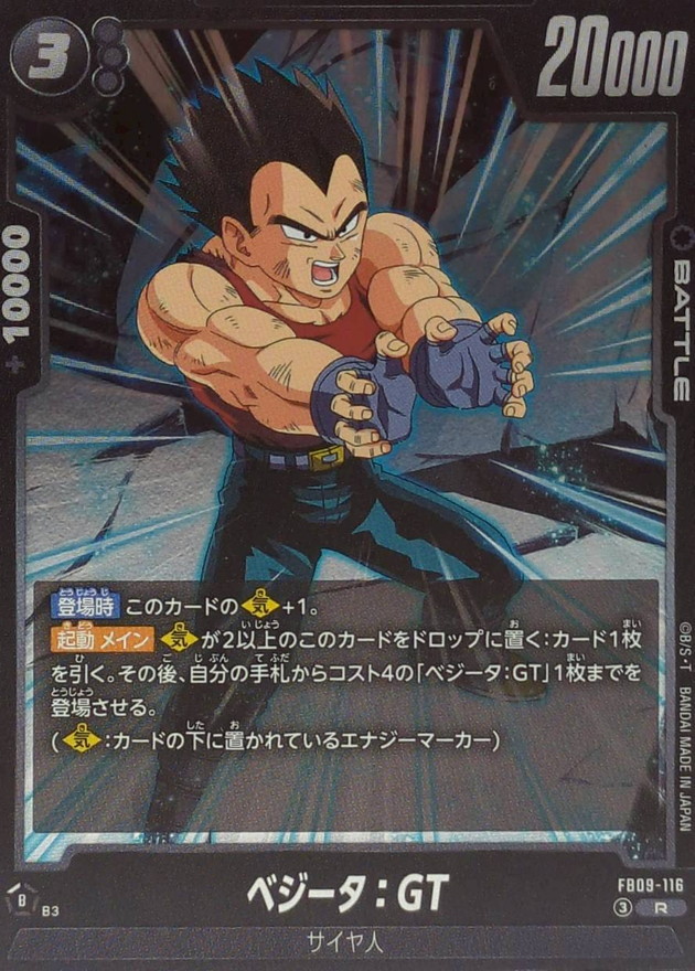 効果 【登場時】このカードの【気】+1。【起動 メイン】【気】が2以上のこのカードをドロップに置く:カード1枚を引く。その後、自分の手札からコスト4の「ベジータ:GT」1枚までを登場させる。(【気】:カードの下に置かれているエナジーマーカー) | |