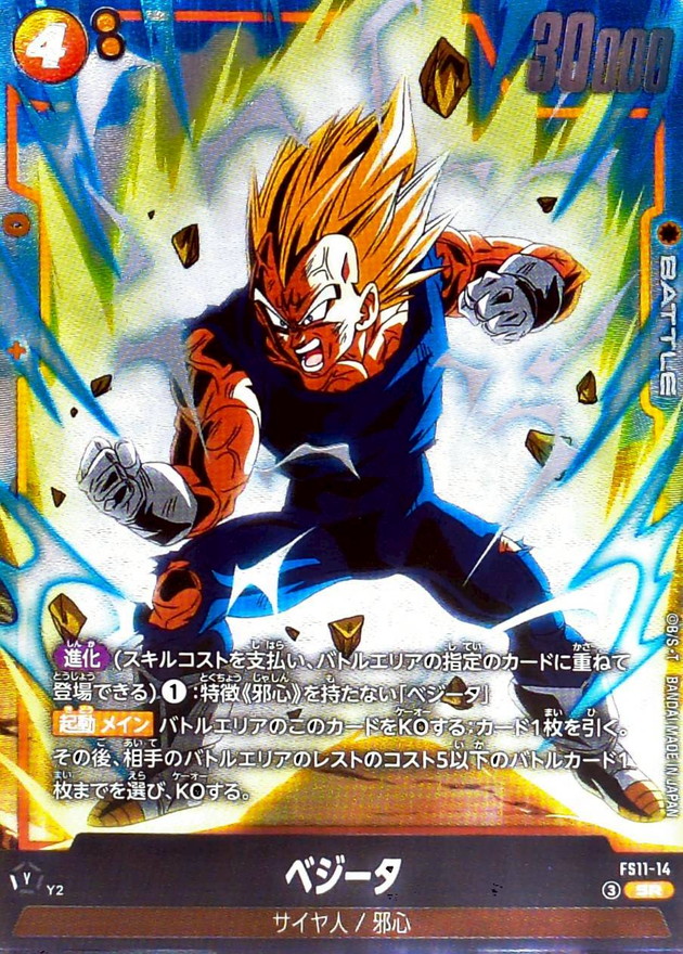 効果 【進化】(スキルコストを支払い、バトルエリアの指定のカードに重ねて登場できる)(1):特徴《邪心》を持たない「ベジータ」【起動 メイン】バトルエリアのこのカードをKOする:カード1枚を引く。その後、相手のバトルエリアのレストのコスト5以下のバトルカード1枚までを選び、KOする。 | |