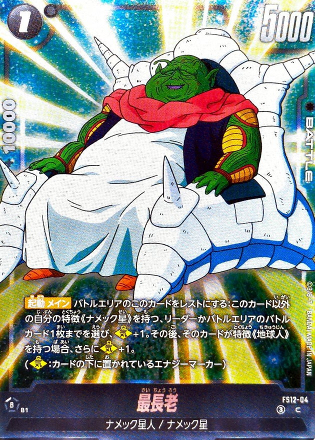 効果 【起動 メイン】バトルエリアのこのカードをレストにする:このカード以外の自分の特徴《ナメック星》を持つ、リーダーかバトルエリアのバトルカード1枚までを選び、【気】+1。その後、そのカードが特徴《地球人》を持つ場合、さらに【気】+1。(【気】:カードの下に置かれているエナジーマーカー) | |