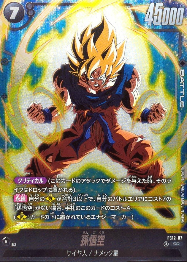 効果 【クリティカル】(このカードのアタックでダメージを与えた時、そのライフはドロップに置かれる)【永続】自分の【気】が合計3以上で、自分のバトルエリアにコスト7の「孫悟空」がない場合、手札のこのカードのコスト-4。(【気】:カードの下に置かれているエナジーマーカー) | |