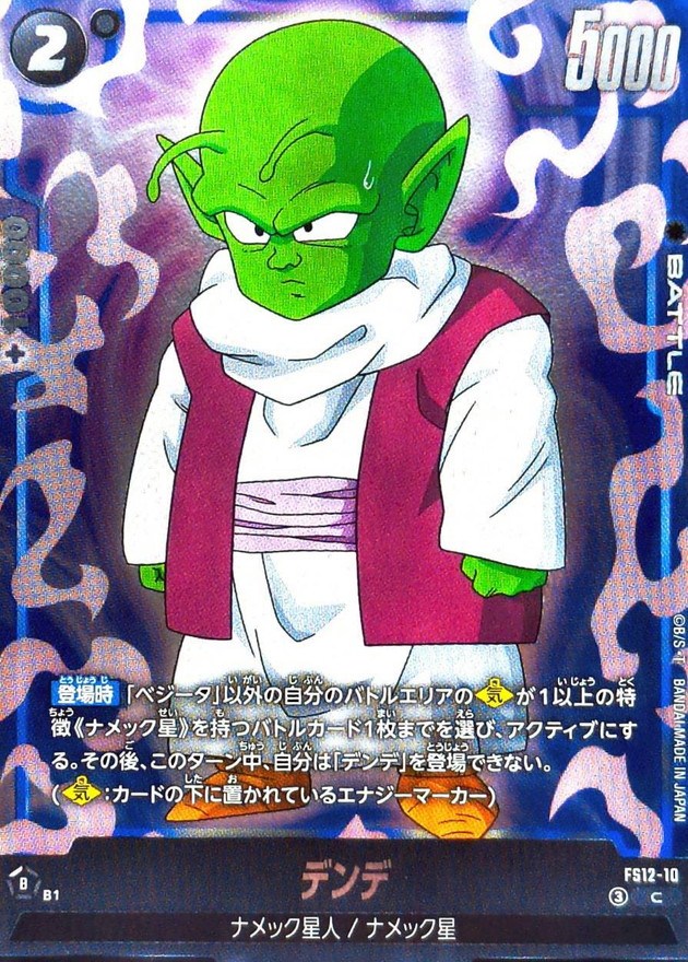 効果 【登場時】「ベジータ」以外の自分のバトルエリアの【気】が1以上の特徴《ナメック星》を持つバトルカード1枚までを選び、アクティブにする。その後、このターン中、自分は「デンデ」を登場できない。(【気】:カードの下に置かれているエナジーマーカー) | |